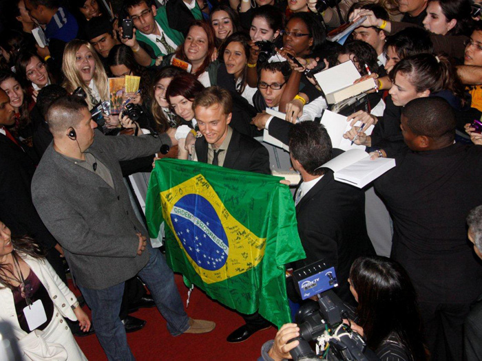 Vestidos de bruxos, fãs de Harry Potter subiram o Morro da Urca, na zona sul do Rio de Janeiro, nesta quinta-feira (14), para assistir a uma pré-estreia exclusiva de As Relíquias da Morte – Parte 2. Tudo para receber o grande convidado da noite: Tom Felton, que ganhou uma recepção calorosa dos fãs e até posou para fotos com a bandeira do Brasil.